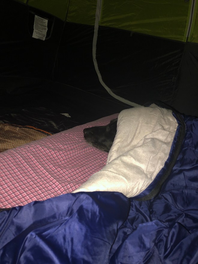 We watched a glorious sunset, but the wind was a little high. As we turned into the tent my loveable, terrified, dog dove into the sleeping bag and air mattress. My sweetheart of a husband said, “let her sleep with you tonight, I’ll take the ground- makes me wish I had realized it was the full sized earlier.”