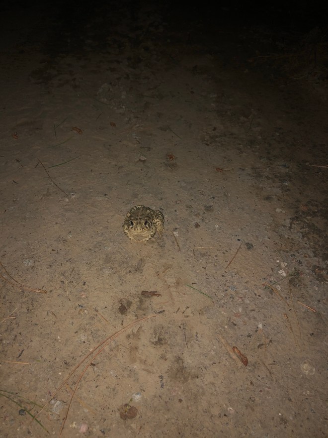 Wade scoped out the outhouses- I’ve used a lot worse. Plus, I had a cute toad to look for when I went to the rest room. He had a prime location on the trail.