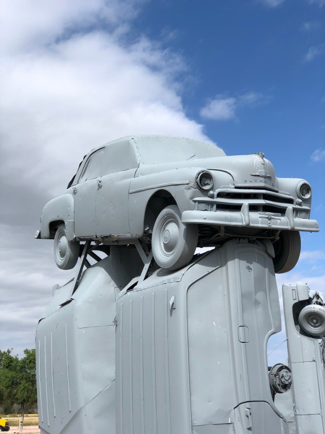 Carhenge is not quite what I was expecting. I thought it would be kitschy, but it was charming and not overtly touristy. It’s actually sculptures and artwork. I thought it was just going to be cars stacked to mimic Stonehenge but there was more to it- I really enjoyed the dinosaur. After walking around and Wade gushing over, and saddened, by the old Jeeps used to create the “henge:- I needed a bathroom again.