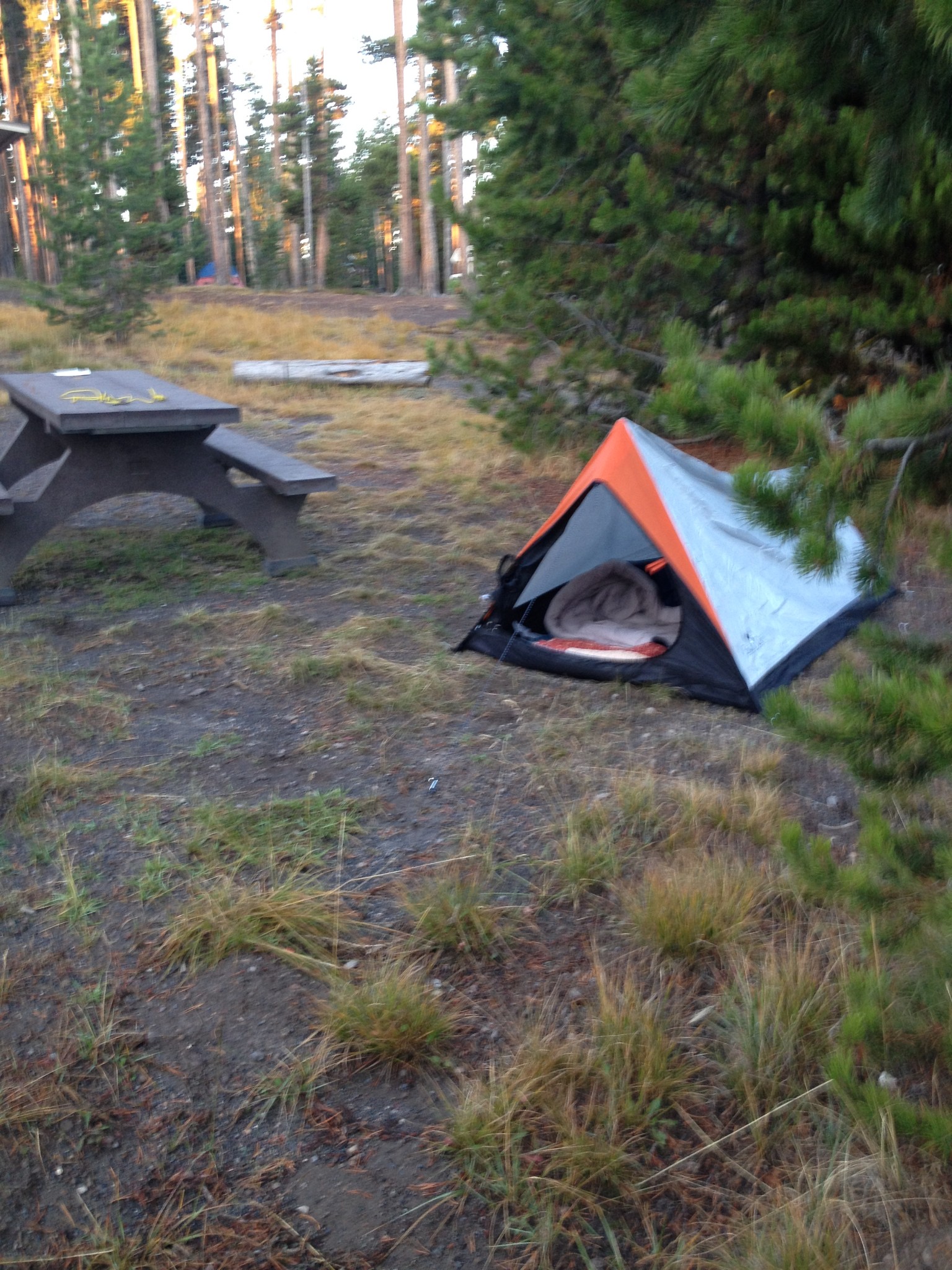 I didn’t roll in until late that evening, after spending time in Grand Teton and driving on the parkway. It took some time to register and get my firewood. However, my tent was an easy one to set up– single person tent. Doing it in the dark was no biggie.
